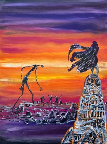 Mağara Kitabesi'nde geçen "Tüm bu ziyaretçiler vicdanımızın bize misafirleridir. Uyandığımda taş yazıtta kara bir epigram gördüm. Etrafım sarazenlerle doluydu. Suretleri; küskün, alaycı ve zalimdi. Sonra yaprakların döküldüğü zaman sen geldin." cümlenin çizimidir.